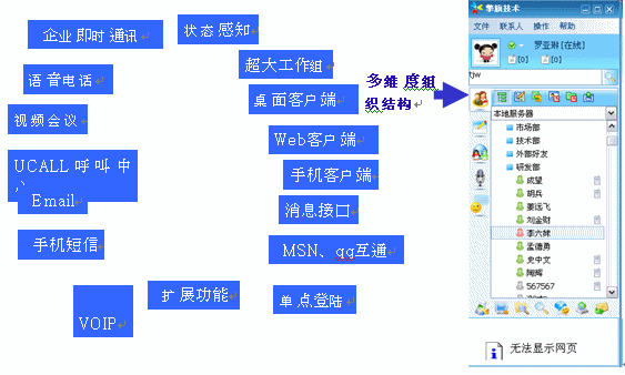UcSTAR:Unified Communication Star,是擎旗技術研發(fā)的統(tǒng)一通訊平臺,它為企業(yè)提供多種通訊手段(企業(yè)即時通信、視頻、語音、郵件、短信、電話、MSN/QQ互通等),并可融合企業(yè)的各種應用系統(tǒng)(OA、ERP、CRM、網站、電子商務系統(tǒng)等);將企業(yè)對外溝通、銷售和服務、對內溝通和協作無縫整合;輕松實現無地域/時間限制的,可管理、可控制、可擴展的,集內外部溝通、服務和銷售一體化的統(tǒng)一工作平臺。此外,它也可被分離應用為企業(yè)IM及實時協作系統(tǒng)、多媒體呼叫中心系統(tǒng)、專業(yè)級的IP視頻會議系統(tǒng)等。