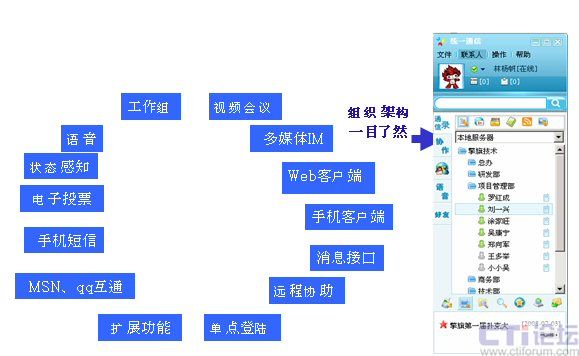 UcSTAR:Unified Communication Star,是擎旗技術(shù)研發(fā)的統(tǒng)一通訊平臺(tái),它為企業(yè)提供多種通訊手段(包括即時(shí)通信、視頻、語(yǔ)音、郵件、短信、MSN/QQ互通等);并可融合企業(yè)的各種應(yīng)用系統(tǒng)(OA、ERP、CRM、網(wǎng)站、電子商務(wù)系統(tǒng)等);將企業(yè)對(duì)外溝通、銷(xiāo)售和服務(wù)、對(duì)內(nèi)溝通和協(xié)作無(wú)縫整合;輕松實(shí)現(xiàn)無(wú)地域/時(shí)間限制的,可管理、可控制、可擴(kuò)展的,集團(tuán)外部溝通、服務(wù)和銷(xiāo)售一體化的統(tǒng)一工作平臺(tái)。此外,它也可被分離應(yīng)用為企業(yè)IM及實(shí)時(shí)協(xié)作系統(tǒng)、多媒體呼叫中心系統(tǒng)、專(zhuān)業(yè)級(jí)的IP視頻會(huì)議系統(tǒng)等。