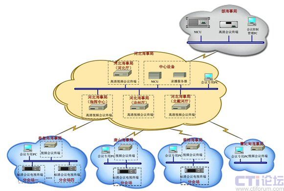 由于前期視頻會議系統(tǒng)測試時(shí)表現(xiàn)出來的良好的兼容性和出色的視音頻效果,河北海事局采用了迪威公司的高清產(chǎn)品及解決方案。按照組織機(jī)構(gòu)的分級結(jié)構(gòu),部海事局采用現(xiàn)有的高清MCU和本局部的高清終端;河北海事局部署高清MCU,既能召開本地視頻會議,又能與部海事局進(jìn)行級聯(lián),實(shí)現(xiàn)召開大會的要求,同時(shí)在本地的指揮中心、各會場放置1臺高清會議終端,在下屬海事處配置1臺標(biāo)清會議終端。
