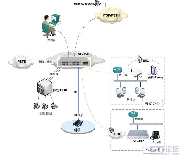 在企業(yè)總部可以部署一臺IP-PBX(如SE150)作為核心設(shè)備,通過模擬中繼接口連接PSTN電話網(wǎng),通過模擬分機(jī)接口連接企業(yè)原有的PBX交換機(jī),再通過IP話機(jī)或網(wǎng)關(guān)來擴(kuò)展新增用戶。IP-PBX下的分機(jī)用戶可以通過模擬中繼連接外線電話,也可以通過IP中繼連接到ITSP的NGN平臺實現(xiàn)外線呼叫,系統(tǒng)通過路由設(shè)定來自動判斷分機(jī)的對外呼叫應(yīng)該由哪條中繼處理,實現(xiàn)最優(yōu)路由和話費的最大節(jié)省。