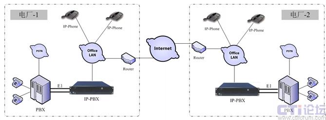 對(duì)于傳統(tǒng)的PBX改造,可以通過(guò)IP PBX的E1端口進(jìn)行連接,通過(guò)PRI或R2信令進(jìn)行通信,這樣傳統(tǒng)PBX下的分機(jī)就可以通過(guò)撥打連接IP PBX的中繼出局號(hào)來(lái)?yè)苋隫OIP系統(tǒng),例如撥“0”到PSTN,撥“9”到IP PBX。兩個(gè)電廠的傳統(tǒng)分機(jī),可以撥“9”后直接撥打?qū)Ψ椒謾C(jī),而IP話(huà)機(jī)都可以通過(guò)直撥的方式互通。