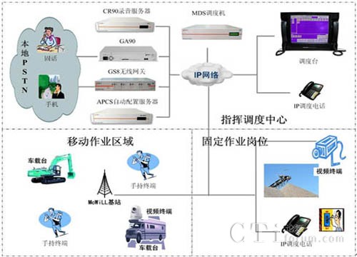 MDS系統(tǒng)可以應(yīng)用于各種作業(yè)現(xiàn)場的指揮調(diào)度, MDS系統(tǒng)不但支持系統(tǒng)基本的語音通信,調(diào)度中心可以通過視頻、數(shù)據(jù)、文本消息等綜合的多媒體方式與作業(yè)人員進(jìn)行通信交互,滿足各種復(fù)雜環(huán)境下的指揮調(diào)度需求。系統(tǒng)可以通過GS8無線網(wǎng)關(guān)、GA90 E1/T1網(wǎng)關(guān)等設(shè)備實現(xiàn)與PSTN網(wǎng)絡(luò)的互聯(lián),滿足與手機(jī)和固話網(wǎng)絡(luò)用戶接入需要。豐富的終端類型可以滿足用戶對固定崗位、移動人員及車輛設(shè)備等不同環(huán)境的使用需求,根據(jù)人員崗位工作性質(zhì)可以配置IP調(diào)度話機(jī)、手持終端和車載臺等終端。