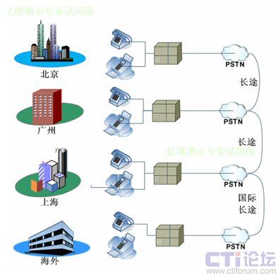各分支機(jī)構(gòu)租用獨立的電話號碼并接入當(dāng)?shù)豍STN,在這種架構(gòu)下,各地之間通話就會產(chǎn)生長途費用,并占用電話線路,但如果使用IP