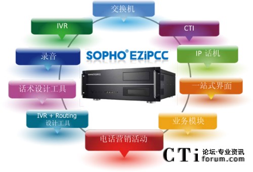SOPHO EZiPCC(簡稱EZiPCC) 基于IP為核心技術(shù)的平臺(tái),以All-In-One 的設(shè)計(jì)理念,提供一體化呼叫 中心解決方案,其中包含了呼叫中心所需要的基本話務(wù)系統(tǒng),例如:PBX,IVR,Recording,CTI