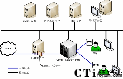整個(gè)呼叫中心分存在兩種通訊方式:語音方式和數(shù)據(jù)方式。語音方式指的是傳統(tǒng)的電話線路,數(shù)據(jù)方式則是指的是各個(gè)應(yīng)用程序間的通訊交互線路。管理語音硬件的有Dialogic語音卡—負(fù)責(zé)整個(gè)系統(tǒng)的語音接入,并處理自動(dòng)語音的相關(guān)動(dòng)作;Alcatel-lucent