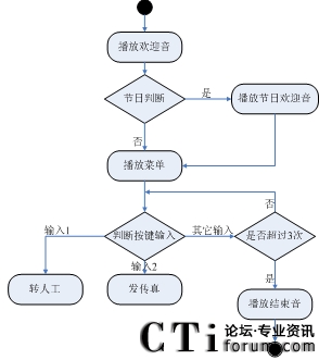 1. 首先播放歡迎音樂 2. 獲取主叫號碼 3. 將主叫號碼直接存入數(shù)據(jù)庫 4. 轉(zhuǎn)人工 |