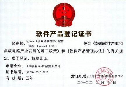 CTI論壇(ctiforum)3月8日消息(記者 袁青): 由易谷網(wǎng)絡(luò)自行研發(fā)的“Egoocall多媒體聯(lián)絡(luò)中心軟件”,于2010年2月10日通過上海市經(jīng)濟(jì)和信息化委員會(huì)審核,獲頒“軟件產(chǎn)品登記證書”。(證書號:滬DGY-2010-0118)