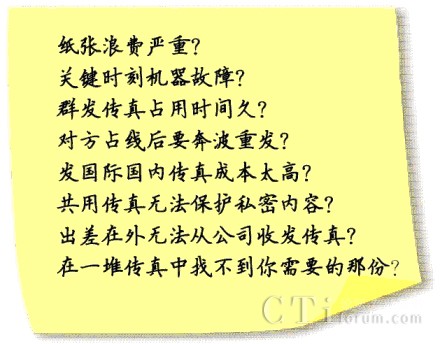 對(duì)于大多數(shù)企業(yè)而言,傳真有其不可替代的地位:銷售、采購、訂單、合同,這些企業(yè)的生命線都離不開傳真。使用傳統(tǒng)的傳真機(jī),您遇到過下列情況嗎?