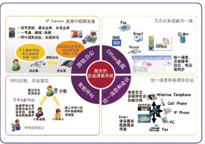 諾基亞西門(mén)子通信綜合企業(yè)通信平臺(tái),針對(duì)網(wǎng)絡(luò)未來(lái)發(fā)展及企業(yè)用戶(hù)對(duì)下一代語(yǔ)音和融合多媒體業(yè)務(wù)的需求,提出了專(zhuān)業(yè)的企業(yè)通信整體解決方案。該方案可以通過(guò)靈活的功能組合幫助運(yùn)營(yíng)商實(shí)現(xiàn)一體化業(yè)務(wù)提供,為企業(yè)和用戶(hù)提供良好的統(tǒng)一使用體驗(yàn),并實(shí)現(xiàn)自我管理。方案集成了豐富的企業(yè)通信和辦公系統(tǒng)的功能,如商務(wù)群業(yè)務(wù)IPCentrex、視頻、托管辦公、會(huì)議、即時(shí)消息、多媒體協(xié)同等。利用該方案運(yùn)營(yíng)商可以根據(jù)用戶(hù)需求實(shí)現(xiàn)快速部署,無(wú)縫地融合現(xiàn)有網(wǎng)絡(luò),實(shí)現(xiàn)現(xiàn)有系統(tǒng)向FMC/IMS系統(tǒng)的平滑過(guò)渡。