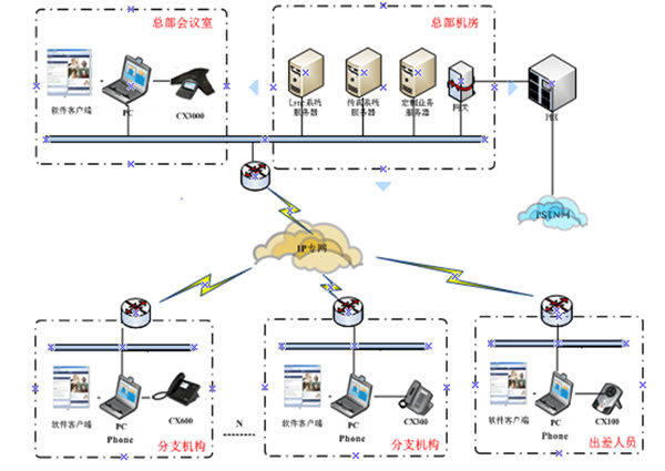在方案的推進過程中,我們在各大會議室部署了CX3000、在桌面分別部署了CX600與IP331。通過這些終端的自身的優(yōu)勢及與系統(tǒng)的配合,實現(xiàn)了完整的電話體驗、PSTN無縫結(jié)合、LYNC完整的企業(yè)級語音功能、 高清晰語音質(zhì)量 、專業(yè)的語音會議等用戶需求。現(xiàn)在此方案在鳳凰網(wǎng)的會議室及桌面的應(yīng)用效果良好,場景應(yīng)用圖如下: