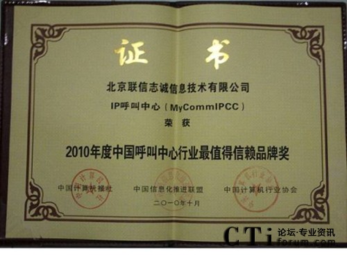 CTI論壇(ctiforum)11月1日消息(記者 潘婷婷):近日,在國家信息化專家咨詢委員會(huì)的指導(dǎo)下,作為中國信息化發(fā)展重要推動(dòng)力量的中國計(jì)算機(jī)報(bào)社、中國計(jì)算機(jī)行業(yè)協(xié)會(huì)、中國信息化推進(jìn)聯(lián)盟等國家級(jí)權(quán)威媒體及國家信息化領(lǐng)域一級(jí)權(quán)威機(jī)構(gòu),共同組織開展“2010中國行業(yè)信息化讀者選擇獎(jiǎng)評(píng)選”,重點(diǎn)展示信息化在行業(yè)應(yīng)用中的優(yōu)秀應(yīng)用案例、產(chǎn)品及解決方案。由中國計(jì)算機(jī)報(bào)社組織業(yè)內(nèi)專家,在經(jīng)過歷時(shí)3個(gè)月的產(chǎn)品征集、方案論證、專家評(píng)審后,北京聯(lián)信志誠信息技術(shù)有限公司(簡稱MyComm公司),其核心產(chǎn)品MyCommIPCC獨(dú)占2010年中國呼叫中心行業(yè)最值得信賴品牌獎(jiǎng)。