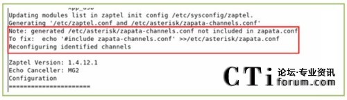 下圖為運行上述命令的輸出,從輸出我們可以發(fā)現一個問題,(使用本文的所用的軟件版本可能會出現的一個問題,其他的版本不一定會出現),/etc/asterisk/zapata-channels.conf