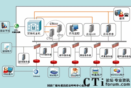系統(tǒng)主要包含IVR服務(wù)器,CTI服務(wù)器,短信網(wǎng)關(guān),郵件服務(wù)器,傳真服務(wù)器,數(shù)據(jù)庫服務(wù)器,座席系統(tǒng)等?蛻魮艽蛱胤柎a接入廣電公司客服系統(tǒng),首先由IVR提供自動語音服務(wù)。CTI服務(wù)器負(fù)責(zé)所有的電話的路由、排隊、轉(zhuǎn)接和控制?蛻粼诮邮茏詣诱Z音服務(wù)時,如果需要人工幫助,可選擇轉(zhuǎn)入人工座席。由IVR系統(tǒng)向CTI發(fā)出轉(zhuǎn)接請求,完成轉(zhuǎn)接功能。