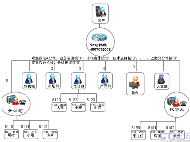 一直以來,呼叫中心座席的形式比較固定,大都通過長期坐在辦公室的人員使用PC機和電話機結(jié)合的方式進行工作。但是,這種形式顯然不能滿足中小企業(yè)運營管理的需要,在以銷售為重的中小企業(yè)中大部分人員并不完全坐在辦公室工作,如客戶經(jīng)理、客戶服務(wù)工程師,即使坐在辦公室,也不會一直在等著接電話,如開發(fā)工程師、生產(chǎn)車間的人員等等。如何既要滿足企業(yè)運營的需要,又要實現(xiàn)呼叫的管理和分配呢?我們只需要將座席的形式簡化,將呼叫分配的目標(biāo)擴大就可以了。手機是目前最常見和普遍的通信工具,只要我們將手機做為座席進行管理,既不改變現(xiàn)有的組織架構(gòu),又能充分利用呼叫分配工作并對工作人員進行管理,這將大大提高中小企業(yè)運營管理的靈活性和變通性。企業(yè)組織架構(gòu)如下: