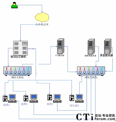 根據(jù)以上業(yè)務(wù)設(shè)計框架,我們確定了客服中心搭建時所需要的設(shè)備,系統(tǒng)的網(wǎng)絡(luò)拓撲結(jié)構(gòu)圖如下:
