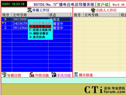 在上圖中,其中信號表示第5路、第7路、第2路分別來了3個電話,其電話號碼顯示在上面。其狀態(tài)都是在導(dǎo)播室中。這時導(dǎo)播想接通某路電話就在某路電話的上面點(diǎn)擊鼠標(biāo)右鍵會出現(xiàn)如下彈出示菜單: