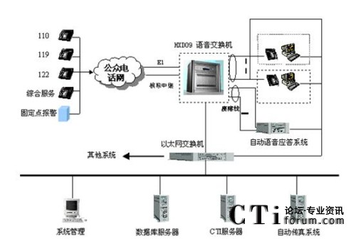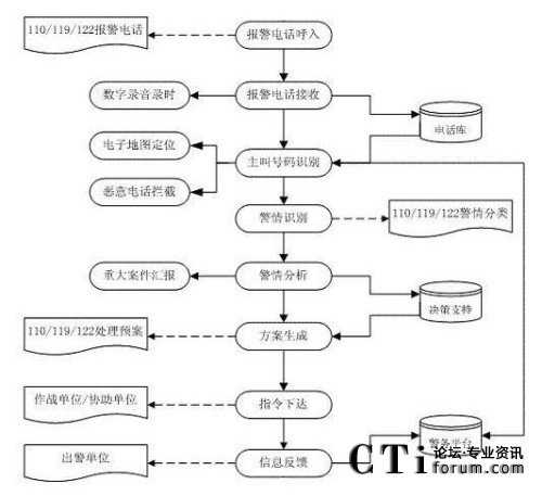 該系統(tǒng)主要分為電信子系統(tǒng)(完成聯(lián)動(dòng)中心與各電信公司之間話音的傳輸、交換和分配,以及主叫號(hào)碼和主叫地址的自動(dòng)查詢和傳輸?shù)龋、接警中心子系統(tǒng)(統(tǒng)一接聽和處理市民的報(bào)警、求助電話)、指揮調(diào)度子系統(tǒng)(或稱為處警中心,通過直觀的地理信息系統(tǒng)和數(shù)據(jù)庫,可以對(duì)所有的資源和警力分布了如指掌。通過一體化的無線數(shù)據(jù)傳輸和無線調(diào)度臺(tái)進(jìn)行方便的統(tǒng)一管理,指揮和調(diào)度)、信息網(wǎng)絡(luò)子系統(tǒng)(聯(lián)動(dòng)中心的骨干網(wǎng)絡(luò),把各種數(shù)據(jù)數(shù)庫、接處警席位、移動(dòng)的警用車載計(jì)算機(jī)等互聯(lián)在一起,形成一個(gè)強(qiáng)大的信息網(wǎng)絡(luò))、無線指揮調(diào)度通信子系統(tǒng)、大屏幕顯示子系統(tǒng)、地理信息子系統(tǒng)、GPS/GIS子系統(tǒng)。