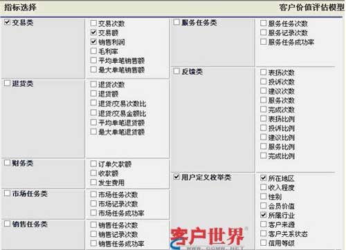 TurboCRM在長期支持CRM應(yīng)用實踐過程中,總結(jié)出一套完整實用的客戶價值評估模型,評估指標(biāo)包括交易類、財務(wù)類、服務(wù)類、反饋類、枚舉類、自定義指標(biāo)等(如圖),結(jié)合不同的指標(biāo)可以幫助企業(yè)評估客戶價值。