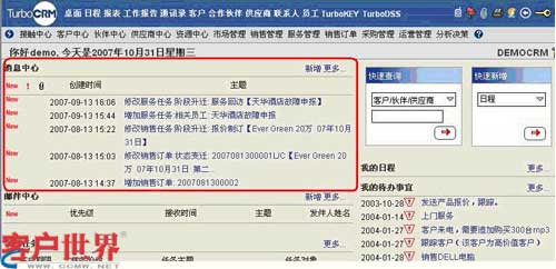 TurboCRM系統(tǒng)的消息中心是協(xié)同工作的核心,當(dāng)客戶接觸過程有進展時,相關(guān)員工的桌面會出現(xiàn)消息提醒,以方便員工及時地了解客戶動態(tài)。