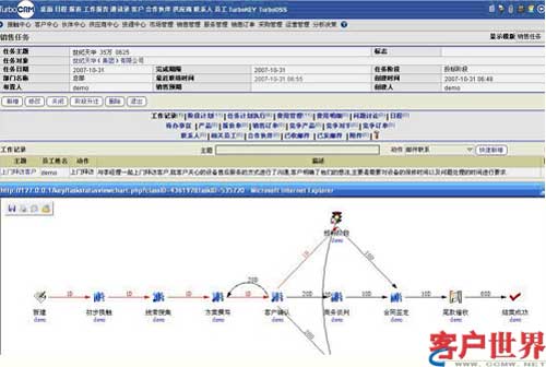 對于復(fù)雜的任務(wù),TurboCRM系統(tǒng)提供了流程定制功能,不僅可以定制靈活流程,也可定制固定流程,將公司的業(yè)務(wù)流程固化在系統(tǒng)中,以指導(dǎo)員工按流程辦事。