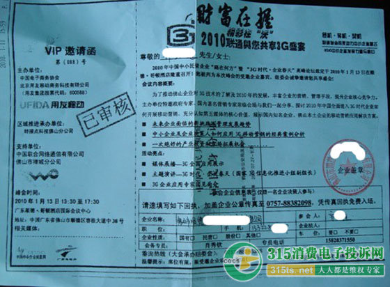 會(huì)場(chǎng)到處都洋溢“中國(guó)聯(lián)通”的氣息。如現(xiàn)場(chǎng)有眾多中國(guó)聯(lián)通的3G宣傳廣告,且發(fā)的材料中還有一份是中國(guó)聯(lián)通的宣傳單,另外,會(huì)議現(xiàn)場(chǎng)甚至還有聯(lián)通3G手機(jī)銷(xiāo)售柜臺(tái)。種種情況讓齊先生等人更堅(jiān)定了他們參加的就是中國(guó)聯(lián)通組織的會(huì)議。