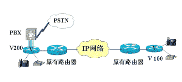 方案說(shuō)明:以快速以太網(wǎng)口接入數(shù)據(jù)網(wǎng)絡(luò),V200-2FXO接本地PBX或直接連入PSTN,V200-2FXS直接提供兩路話(huà)音接入。