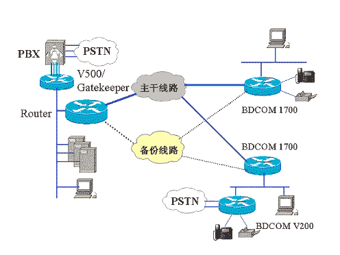 500作為Gatekeeper的Server端,V 200 作為Client端,實(shí)現(xiàn)語(yǔ)音和數(shù)據(jù)集成應(yīng)用。