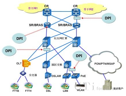 用戶身份的識別可以通過傳統(tǒng)的PPPoE和IPoE協(xié)議部分實(shí)現(xiàn),為了解終端類型、地理位置等信息,可對上述協(xié)議進(jìn)行擴(kuò)展或引入新的協(xié)議支持;對于業(yè)務(wù)類型的識別,業(yè)界普遍認(rèn)為應(yīng)通過引入深度包檢測DPI(Deep Packet Inspection)技術(shù)來實(shí)現(xiàn)。DPI設(shè)備可以多種形態(tài)和多種方式部署在網(wǎng)絡(luò)接入層或匯聚層,例如與PTN設(shè)備、城域網(wǎng)的BRAS或SR共框,或者獨(dú)立部署。
