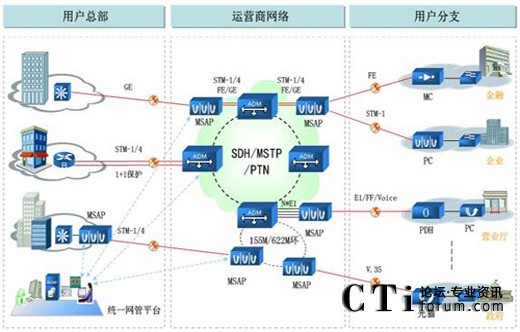 在政府、金融、能源、教育、商業(yè)連鎖等大客戶遠端機房,根據(jù)用戶不同類型的業(yè)務(數(shù)據(jù)、視頻、語音)配置相應的轉(zhuǎn)換設備,如光纖收發(fā)器、V35協(xié)議轉(zhuǎn)換器、以太網(wǎng)協(xié)議轉(zhuǎn)換器、以太網(wǎng)/E1/V35光貓、PDH等,在運營商的模塊局/基站等接入機房部署MSAP機箱并配置相對應的業(yè)務線卡,將遠端PDH、FE、V.35、語音等多種接入方式的多路業(yè)務匯聚后通過STM-1/STM-4等上行口與運營商傳輸網(wǎng)SDH/MSTP/PNT對接。在運營商中心機房,可以根據(jù)需要配置機箱式MSAP,匯聚后通過GE光纖接入用戶中心機房,也可以直接通過155M/622M/FE/GE光纖接入用戶中心機房,在用房中心機房配置MSAP進行協(xié)議還原,或直接接入用戶核心路由器的CPOS板卡上。這樣,就完成了整個專網(wǎng)業(yè)務的接入。
