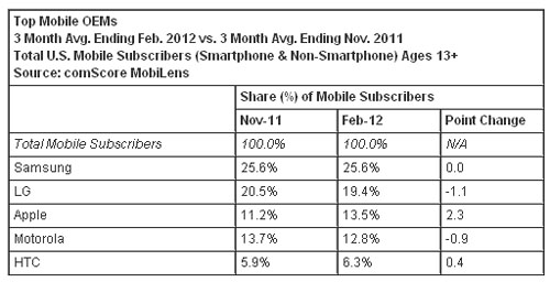 按截至今年2月份的三個月的平均數計算,美國13歲以上的手機用戶數為2.34億。三星名列手機原始設備制造商之首,占有美國手機市場25.6%的份額;LG電子名列第二,占有19.4%的市場份額;蘋果排名第三,占有13.5%的市場份額(上升2.3個百分點);摩托羅拉排名第四,占有12.8的市場份額;HTC排名上升至第五,占有6.3%的市場份額(上升0.4個百分點)。