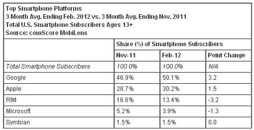 按截至今年2月份的三個月的平均數計算,美國智能手機用戶數超過1.04億人,相比截止去年11月的三個月的平均數增長14%。谷歌Android操作系統(tǒng)在美國手機市場的份額超過50%,相比去年同期上升了17個百分點;蘋果iOS操作系統(tǒng)排名第二,其市場份額為30.2%(與去年同期相比上升了5個百分點);其后依次是RIM黑莓操作系統(tǒng)的13.4%,微軟Windows