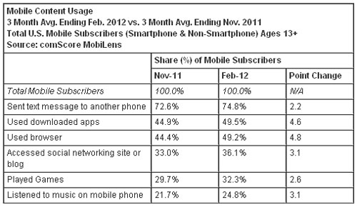 按截至今年2月份的三個月的平均數計算,美國手機用戶中有74.8%的用戶利用手機發(fā)送短信,相比截止去年11月的三個月上升2.2個百分點;有49.5%的用戶使用了下載的應用程序(上升4.6個百分點),有49.2%的用戶使用瀏覽器(上升4.8個百分點),有36.1%的用戶訪問社交網站或博客(上升了3.1個百分點);有32.3%有用戶利用手機玩游戲(上升2.6個百分點),有24.8%的用戶利用手機聽音樂(上升3.1個百分點)。