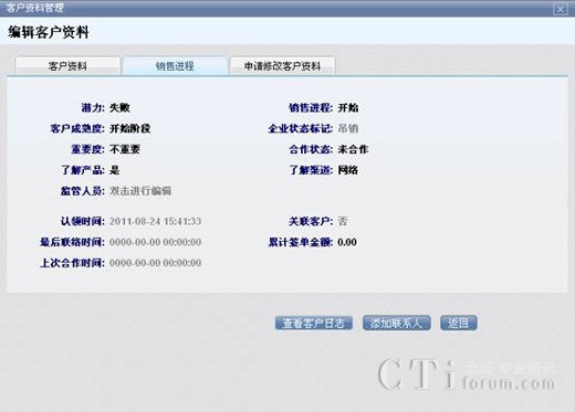 點擊標簽選擇要查看的客戶資料,和銷售進程。查看客戶日志能看到該客戶被執(zhí)行操作的歷史情況,例如資料的變更,所屬的變更等等。添加聯(lián)系人是指為當前客戶添加新的聯(lián)系人,添加完聯(lián)系人信息后,聯(lián)系人就會被納入到該客戶資料里。