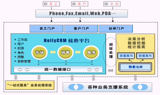 更關(guān)鍵是,HOLLYCRM(合力金橋軟件)的CRM不是單純的、簡單的客戶管理產(chǎn)品,它是一套完整的解決方案,覆蓋了協(xié)作型、運營型和分析型的全部范疇,其結(jié)構(gòu)框架見圖,其核心平臺涉及到市場、銷售、服務等多個環(huán)節(jié),并通過數(shù)據(jù)集市或者數(shù)據(jù)倉庫的形式,提供數(shù)據(jù)挖掘、決策分析等服務。最關(guān)鍵的是,HOLLYCRM(合力金橋軟件)在提供解決方案外,還不斷提升管理和咨詢能力,和一些咨詢公司合作,將咨詢和產(chǎn)品作為一個整合的方案提供給用戶,并提供360度的系統(tǒng)咨詢、設計和實施、維護服務。