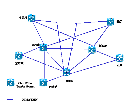 北京電信公眾IP網(wǎng)的骨干節(jié)點(diǎn)構(gòu)成的骨干網(wǎng)拓?fù)淝闆r如圖: