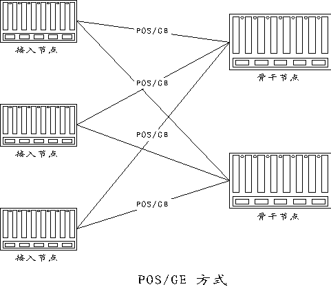北京電信公眾IP網(wǎng)的接入節(jié)點(diǎn)與骨干節(jié)點(diǎn)之間的連接根據(jù)線路和帶寬的要求采用Packet Over SDH和千兆位以太網(wǎng)技術(shù)。