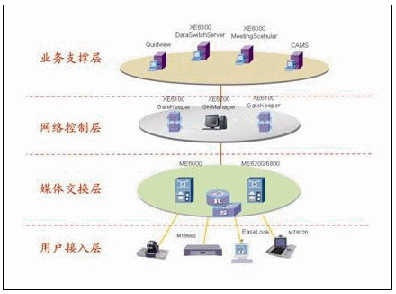 網(wǎng)絡(luò)控制層包括Quidway XE6100 GateKeeper和Quidway XE6100 GK Manager。