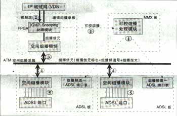 可實現高效的兩級組播;诳臻g總線上的組播信元技術實現,與組播用戶數無關,同一節(jié)目即使所有用戶加入該頻道,僅需復制一份,不用逐個用戶復制到每個用戶端口,極大節(jié)省了背板帶寬,減輕IP上行負擔?蓪崿F高性能硬件組播轉發(fā)。IP上行板采用超大規(guī)模FPGA硬件邏輯處理組播報文,ADSL板采用空間組播處理硬件芯片自動完成向每個ADSL端口(用戶)的組播復制,每ADSL端口組播帶寬6M。