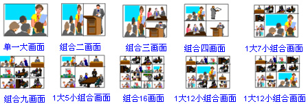 華為高清視訊系統(tǒng)采用了數(shù)字多畫面合成技術,系統(tǒng)全面提供2、3、4、6、8、9、13、16等不同的9種畫面組合模式,在會議過程中,多畫面的格式可以通過主席或管理員隨意切換,同時會議過程中也可以在單多畫面之間的自由切換。支持的多畫面組合模式如下: