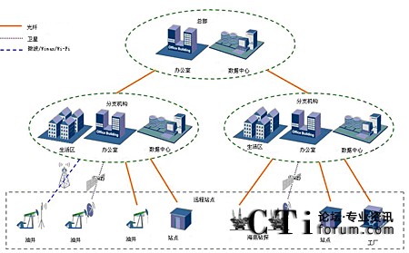 石油行業(yè)客戶根據(jù)行業(yè)特點和組織結構,其內部通訊辦公網絡的拓撲結構大致如下: