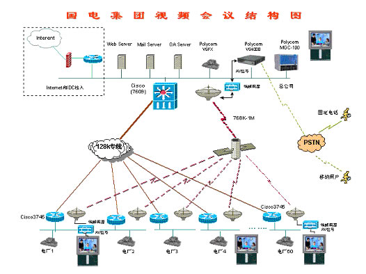 128,集團下屬60個電廠均采用視頻終端ViewStation 128。整個網絡采用Polycom MCU的混速功能,在本部中心采用768Kbps進行視頻傳輸,和下屬60個電廠及分公司采用128Kbps進行傳輸。由于網絡傳輸線路分為衛(wèi)星線路和地面有線網絡,衛(wèi)星線路帶寬為768Kbps-1Mbps,用于業(yè)務下行線路,地面有線網絡128Kbps用于視頻回傳。根據網絡傳輸線路的實際情況,在本部中心利用1臺視頻終端將其模擬信號(AV信號)送到衛(wèi)星端接設備(包含MODEM,編解碼器等),將模擬信號轉換成數(shù)字信號(MPEG4),利用768K-1Mbps衛(wèi)星線路廣播到每個接收點,通過每個接收點的編解碼器將數(shù)字信號轉換成模擬信號連接到顯示終端(如TV、顯示器)上進行收看,通過這種方式可以實現(xiàn)利用衛(wèi)星線路的高帶寬,并利用其廣播特性,節(jié)省投資。