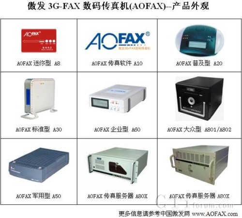 由金恒科技推出的全系列數(shù)碼傳真產(chǎn)品涵蓋了上述三個種類,上圖就是AOFAX無紙傳真產(chǎn)品系列的外形圖。其中迷你型A8和傳真軟件A10屬于第一種,普及型A20、標準型A30、軍用型A50和企業(yè)型A60屬于第二種,大眾型A801/A802和專業(yè)型傳真服務(wù)器則屬于第三種。