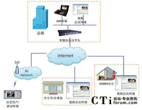 本系統(tǒng)通常將會議系統(tǒng)安裝于公司總部,應(yīng)用服務(wù)器與媒體服務(wù)器全部實現(xiàn)雙掛,同時接入公司內(nèi)網(wǎng)和公網(wǎng)。各分公司安裝的視頻數(shù)據(jù)會議終端、SIP話機(jī),通過Internet或?qū)>聯(lián)接到總部會議服務(wù)器的公網(wǎng)出口。公司內(nèi)部辦公室、會議室的視頻數(shù)據(jù)會議終端、SIP話機(jī),通過局域網(wǎng)連接到會議服務(wù)器。會議服務(wù)器通配合IPPBX、語音網(wǎng)關(guān),接入外線,實現(xiàn)普通電話和手機(jī)接入會議。全面支持IP電話和模擬電話。當(dāng)遠(yuǎn)程用戶沒有條件進(jìn)行視頻數(shù)據(jù)會議時,可以單獨使用音頻,或者音頻+數(shù)據(jù)的方式進(jìn)行會議,以保證在網(wǎng)絡(luò)條件很差時也能夠進(jìn)行協(xié)同辦公。本系統(tǒng)采用不同級別的IPPBX或語音網(wǎng)關(guān)直連FXO口接入PSTN市話,保留了傳統(tǒng)的模擬電話線路。