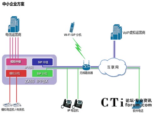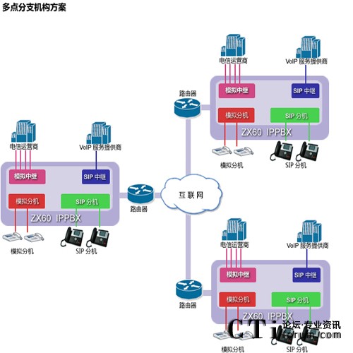 ZX60不僅具有本地電話分機(jī)接口,還運(yùn)行IP電話機(jī)遠(yuǎn)程注冊(cè),無(wú)論你若干個(gè)辦公室分布在何處,都可以打造成你內(nèi)部免費(fèi)通話的集團(tuán)電話通信系統(tǒng),節(jié)約你的內(nèi)部通信成本,提高辦公效率。