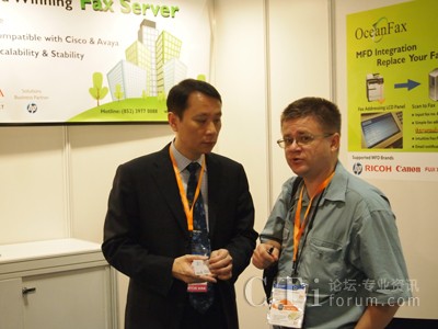 圖:傲訊全通CEO謝昭興先生(左)向來訪買家介紹OceanFax傳真服務器的最新功能