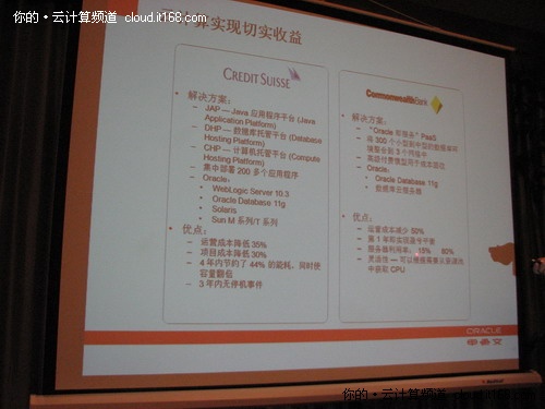 還有一個(gè)客戶是澳大利亞聯(lián)邦銀行(Commonwealth Bank)。該公司選用Oracle Database 11g和Oracle數(shù)據(jù)庫云服務(wù)器,開發(fā)了一個(gè)名為“Oracle即服務(wù)”的PaaS,將300個(gè)中小型數(shù)據(jù)庫環(huán)境整合到3個(gè)網(wǎng)格中。目前該銀行運(yùn)營成本減少50%,根據(jù)需要就可從資源池中獲取CPU,實(shí)現(xiàn)了靈活性, 在第1年即實(shí)現(xiàn)盈虧平衡。