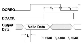 在上圖中,當(dāng)有效數(shù)據(jù)在緩沖存儲器中等待被輸出時(shí),此時(shí)板卡上DOREQ的信號準(zhǔn)位會被拉高,以通知接收端輸出數(shù)據(jù)已經(jīng)被送出,當(dāng)接收端收到數(shù)據(jù)時(shí),則會產(chǎn)生DOACK的信號通知發(fā)送端數(shù)據(jù)已完成接收,發(fā)送端收到此一信號后,即將DOREQ準(zhǔn)位拉低,并等待下一筆要輸出的數(shù)據(jù),而不斷重復(fù)上述步驟,直到將所有數(shù)據(jù)輸出完成。所以當(dāng)兩個(gè)支持交握信號的模塊在數(shù)據(jù)傳輸時(shí),其正確的接線方式為將輸出端的ACK訊號線與輸入端的REQ訊號線相聯(lián)接,輸出端的REQ訊號線與輸入端的ACK訊號線相聯(lián)接。凌華科技的PCI-7300A高速數(shù)字I/O卡,支持外部時(shí)脈及完整的信號交握傳輸,其最高傳輸速度達(dá)80MB/sec,數(shù)據(jù)長度可依使用者的需求設(shè)定為8、16、及32