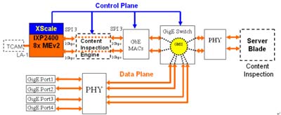 Inspection),表頭辨識系針對其流向、連結(jié)、輸入端口及目的地址等做比對;內(nèi)容檢查則有復雜的算法,處理頻寬及內(nèi)存容量需求極高,很顯然內(nèi)容檢查即將是此系統(tǒng)非常嚴重的交通瓶頸所在,這個運算將耗用大量IXP-2400網(wǎng)絡(luò)處理器的運算資源。因此必須采用另一個處理器卸載此運算,有兩種方法可行,其一是如圖四:加入一顆個可程序內(nèi)容檢查引擎(Programmable