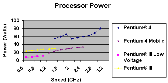 在CompactPCI演進(jìn)的歷史軌跡中,x86處理器已經(jīng)經(jīng)歷過(guò)非常顯著的變化。有些非常早期的卡板用的是66MHz的CPU,目前這一代的x86產(chǎn)品,包含了1.7GHz Mobile Pentium 4 CPU。在嵌入式工業(yè)對(duì)支持長(zhǎng)生命周期的產(chǎn)品需求,造成了產(chǎn)品制造廠在處理器的選擇上,傾向從嵌入式或有長(zhǎng)周期支持的產(chǎn)品線(xiàn)去選擇。這些產(chǎn)品并不像桌上型計(jì)算機(jī)或服務(wù)器的處理器那樣走得那么先端,這些產(chǎn)品的生命周期是用年而不是用月來(lái)計(jì)算的。此外,這個(gè)產(chǎn)業(yè)也藉由使用mobile processor而取得一些優(yōu)勢(shì),這種處理器在電源供應(yīng)的需求上和嵌入式以及電信領(lǐng)域的應(yīng)用非常類(lèi)似。下圖提供了Pentium各系列的處理器與其功率消耗的一個(gè)關(guān)連性,可以看到Pentium III與Mobile Pentium 4處理器家族的產(chǎn)品符合了今日CompactPCI板卡對(duì)處理器所提供的30Watts功率規(guī)格。