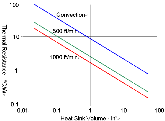從圖上可以看出散熱片的散熱能力并不和風(fēng)速成一線(xiàn)性函數(shù),在熱阻上一個(gè)非常顯著的改善,會(huì)在稍呈對(duì)流狀態(tài)的空氣與每分鐘500英尺的風(fēng)速情況下顯現(xiàn)出來(lái),但是從每分鐘500英尺增加到每分鐘1000英尺的風(fēng)速時(shí),熱阻的改善就沒(méi)那么顯著了。另一個(gè)用吹風(fēng)方式的限制因素是噪音,當(dāng)吹過(guò)卡板與散熱片的風(fēng)速增加時(shí),所產(chǎn)生的噪音也會(huì)增加。從實(shí)務(wù)面來(lái)看,大部分的CompactPCI機(jī)箱提供每分鐘300英尺的風(fēng)速,如先前提到的,散熱片通常會(huì)被內(nèi)存以及PMC的空間給限制了大小,一個(gè)CompactPCI卡板若含有兩個(gè)PMC的設(shè)計(jì),通常會(huì)有一個(gè)處理器散熱片的大小約為3